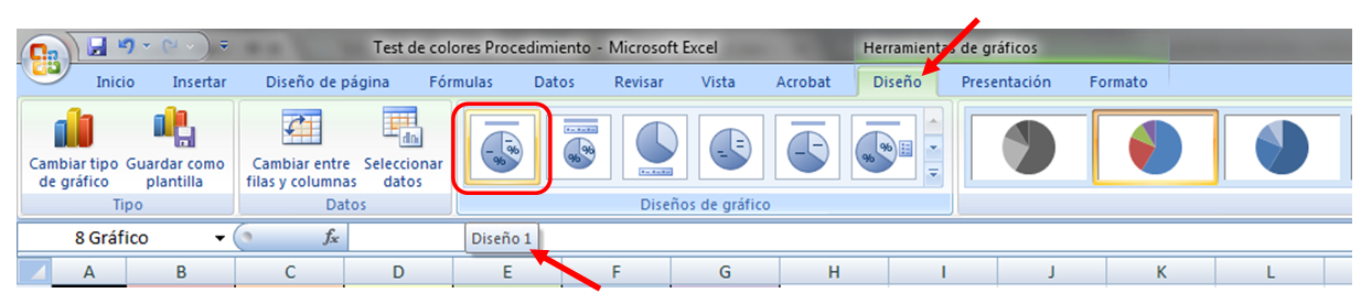 Selecciona la pestaña "Diseño" y en la parte de "Diseños de gráfico" elige el Diseño 1. Esto con el fin de que aparezcan los porcentajes en cada parte de la gráfica, hazlo como se muestra en la imagen.