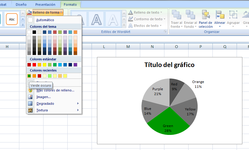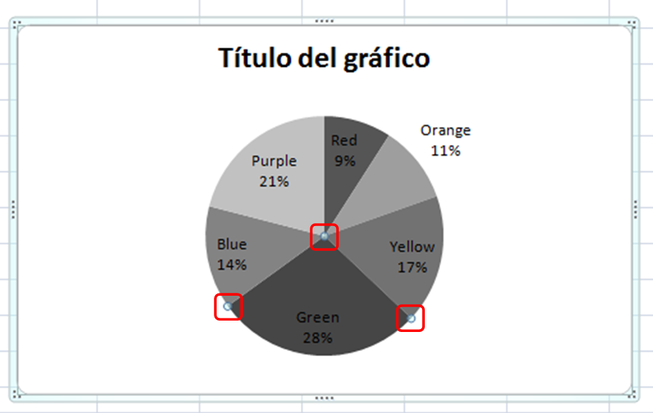 NOTA: Para lograr que apareciera el nombre del color dentro de cada rebanada fue necesaria la tabla de resultados en la que no sólo seleccionamos los totales, sino también los nombres de los colores correspondientes a cada columna. Si solamente hubiéramos seleccionado la fila de resultados, la gráfica no habría mostrado los nombres de los colores en cada rebanada.